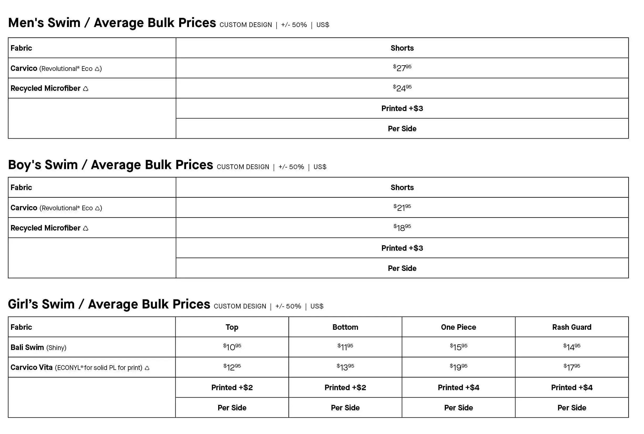 Custom Swim Price Lists