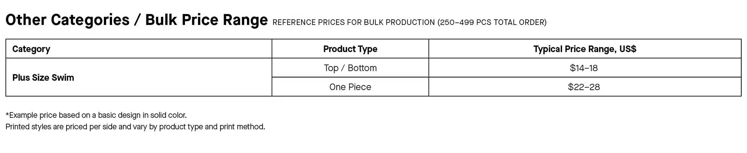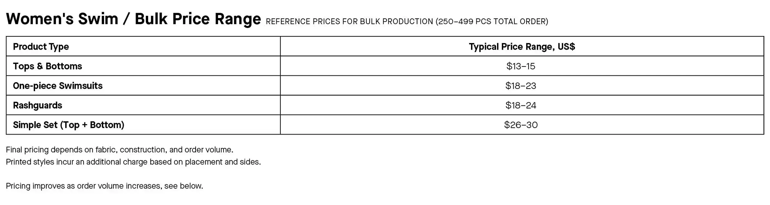Suppose you want to develop 5 different designs for a new swimwear line. You choose Bali Swim to produce your designs for you, and you’re ready to order. Your total budget is $10,000 for manufacturing and after viewing our tables, it looks like you can produce roughly 500 units or so in bulk, and have some money left over to factor into your next order.