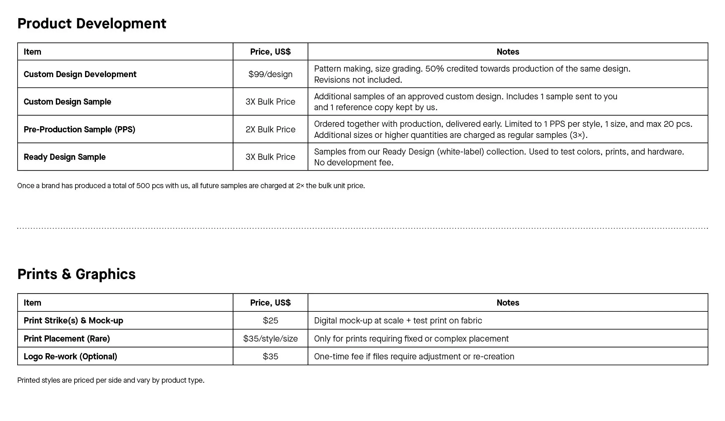 Sample development fee (US$99/design)