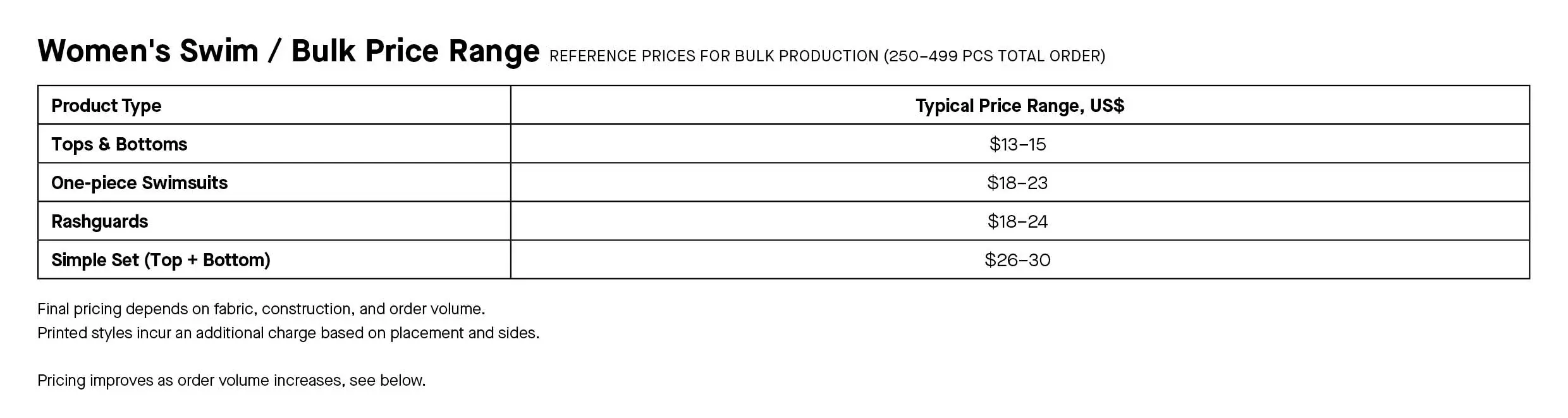 Suppose you want to develop 5 different designs for a new swimwear line. You choose Bali Swim to produce your designs for you, and you’re ready to order. Your total budget is $10,000 for manufacturing and after viewing our tables, it looks like you can produce roughly 500 units or so in bulk, and have some money left over to factor into your next order.